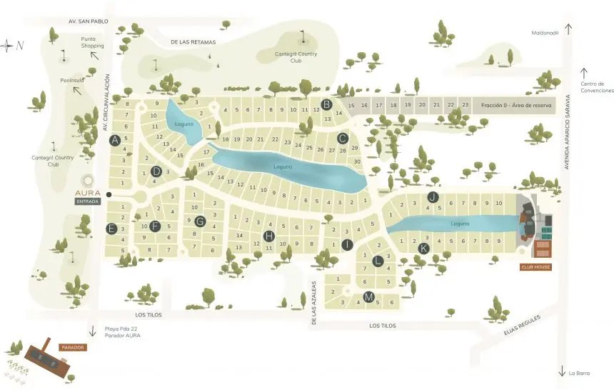 Aura es un barrio cerrado lIndero al Cantegril Golf Club de Punta Del Este, donde la naturaleza se combina con seguridad y ubicación premium, con todo lo necesario para vivir una vida tranquila en familia. Financiación – 30% de Anticipo + cuotas. Es la oportunidad de invertir en uno de los barrios más exclusivos de Punta del Este, con vías de acceso inmejorables para la vida cotidiana. Cerca de colegios, la playa y los centros comerciales. 184 lotes de 1.000 M2, rodeados de bosques y 3 lagunas. Amenities: _ Beach House _ Club House _ Restaurante y bar _ Playa Privada y parador exclusivo _ Kidshouse _ Gimnasio _ Cancha de Tenis y Padel _ 3 Piscinas Aura cuenta también con un sofisticado sistema de seguridad, amenities, programa de sustentabilidad, parador y servicio de playa. En Aura, tres espejos de agua se regeneran para crear espacios de dispersión e integración con la naturaleza a través de un sistema de ingeniería de vanguardia. Consultanos