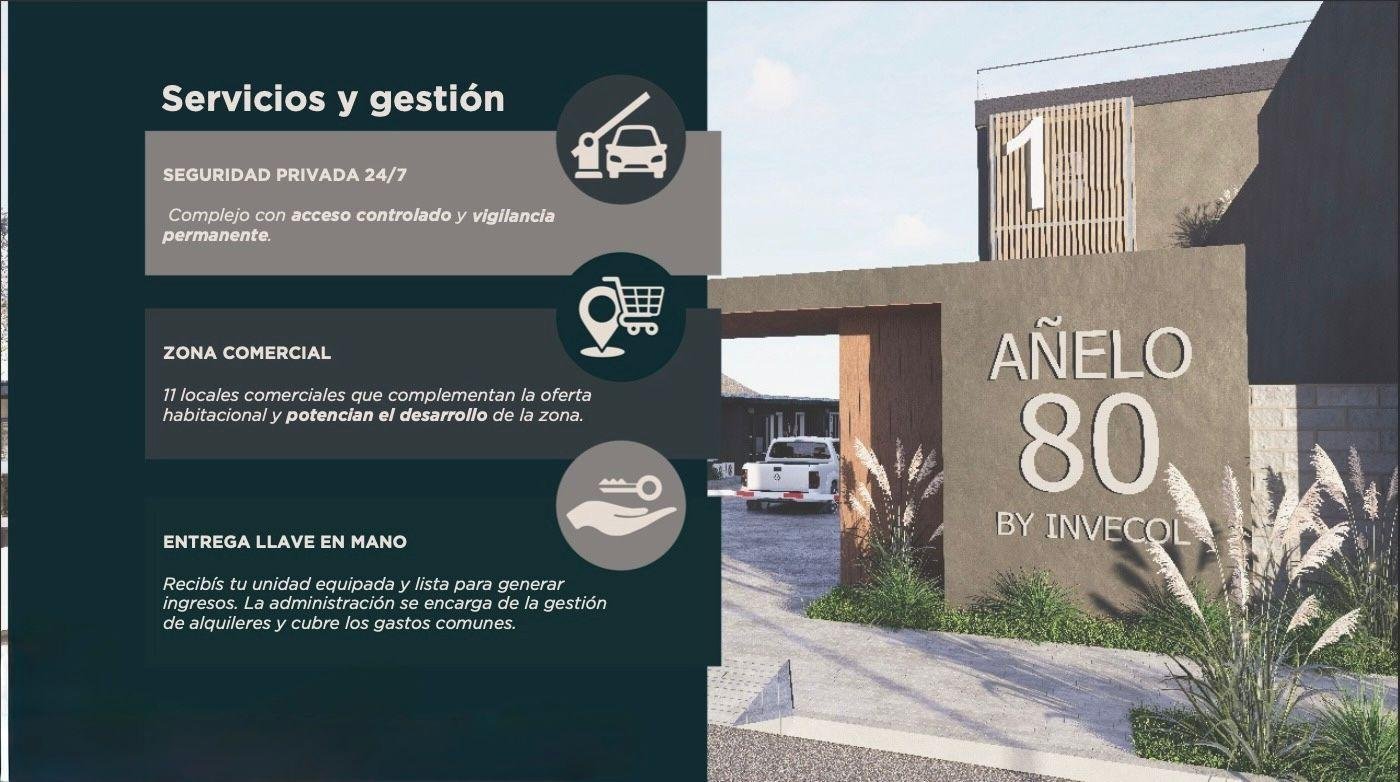Proyecto Añelo 80: Fideicomiso inmobiliario en Vaca Muerta Renta mensual de U$D 1.800 El Proyecto Añelo 80 es un condominio con 69 unidades de vivienda y 11 locales comerciales, diseñado para los trabajadores del sector petrolero en Vaca Muerta. El modelo se entrega "llave en mano", con la gestión total de los alquileres y expensas a cargo del desarrollador. Ubicación y diseño El condominio está en el norte de Añelo, junto a la Ruta 17/7 y el parque industrial, lo que garantiza un acceso rápido a los centros de trabajo. El diseño de cada unidad de 52 m² es funcional, incluye hasta 4 camas y 2 baños, y cuenta con servicios de agua, electricidad y biodigestores individuales. La estética es moderna, sobria y de bajo mantenimiento. Materiales y terminaciones Las unidades tienen terminaciones duraderas y eficientes: Revestimiento exterior: Siding de fibrocemento, que combina una estética moderna con bajo mantenimiento. Aberturas: De PVC, pensadas para un óptimo ahorro de energía. Techos: Paneles con placas de EPS en el interior, que ofrecen aislamiento térmico. Pisos: Porcelanato símil madera en áreas comunes y dormitorios, y porcelanato símil mosaicos en las duchas. Griferías y sanitarios: Griferías Piazza o similar, y sanitarios Ferrum o similar. Cocina: Muebles de melamina. Servicios adicionales El condominio ofrece servicios gestionados por el edificio para mayor comodidad de sus residentes: Estacionamiento privado. Seguridad las 24 horas. Limpieza diaria. Servicio de lavandería.