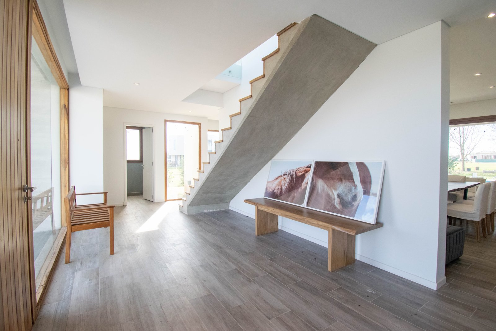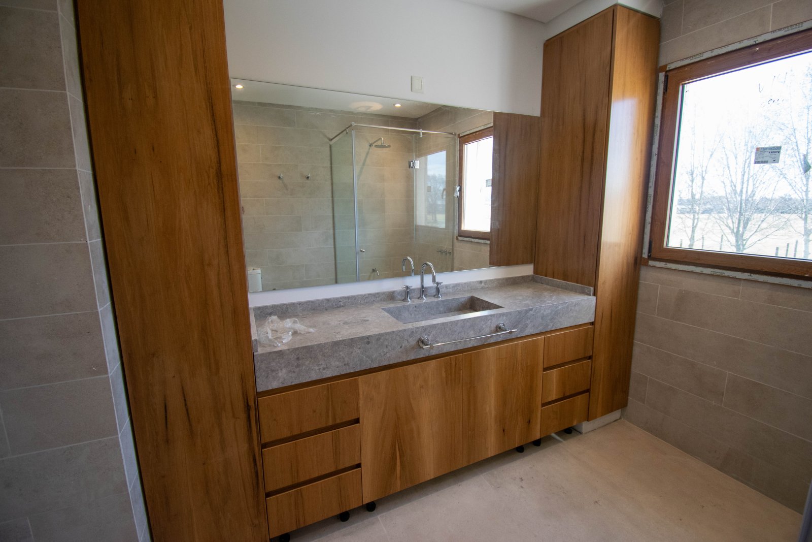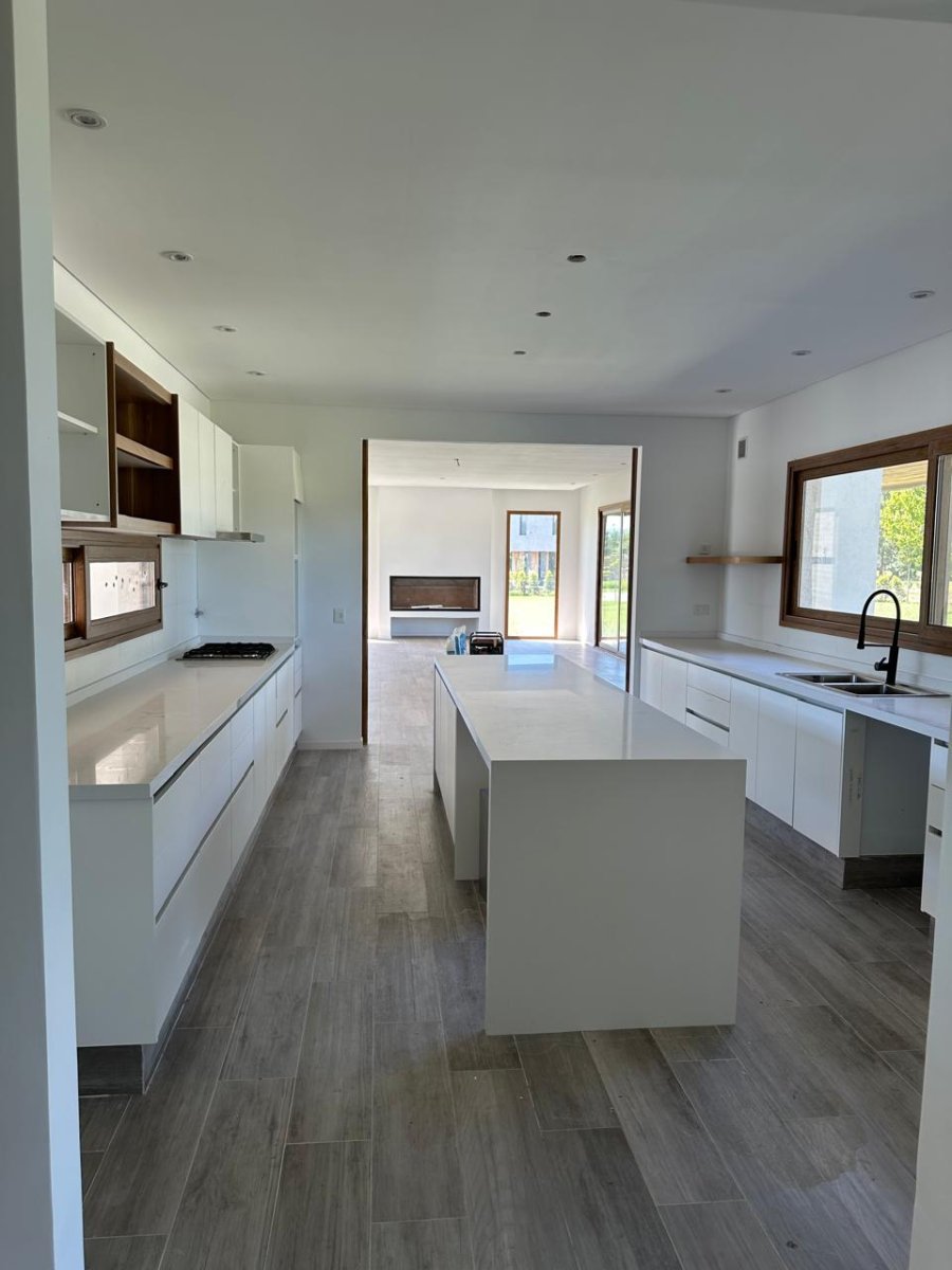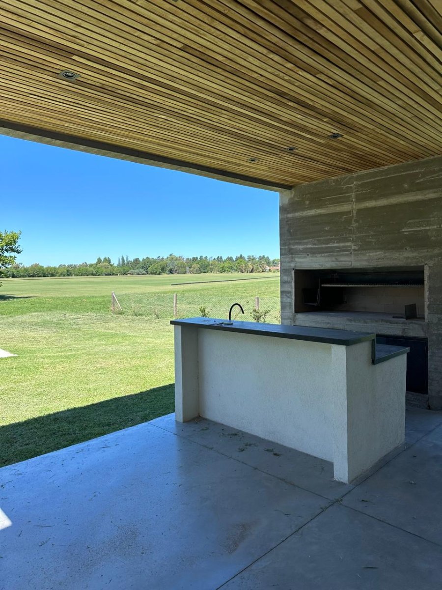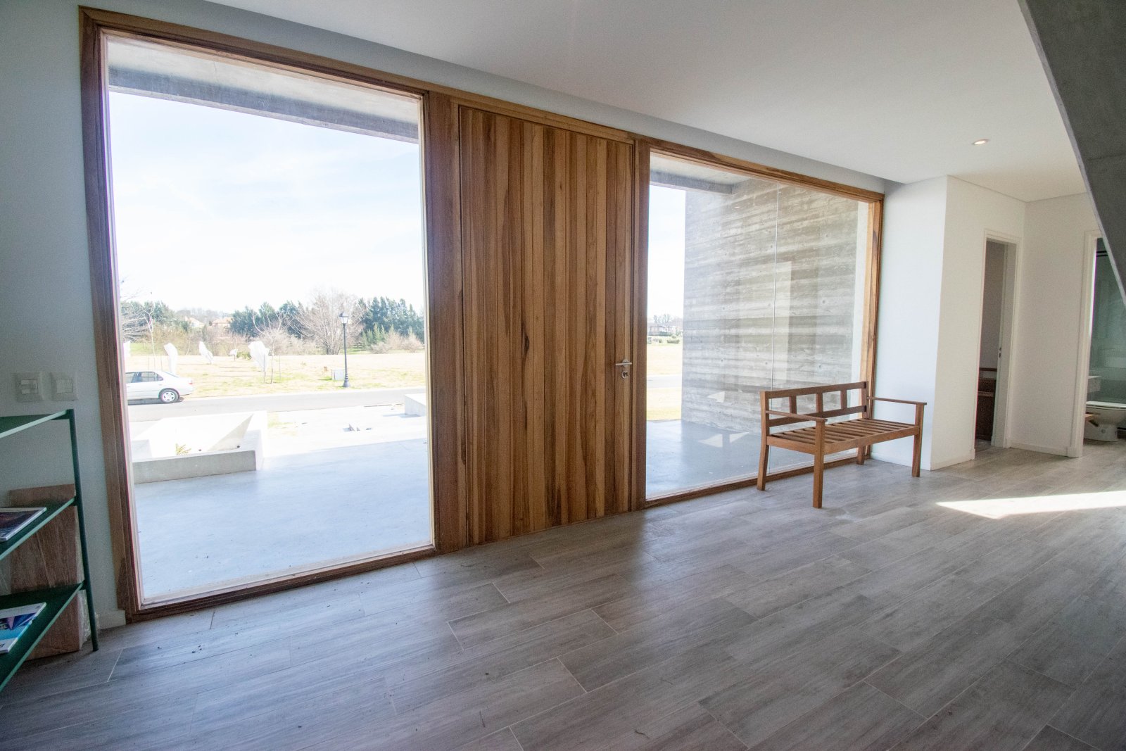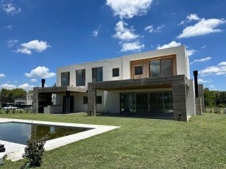 Casa a estrenar en Pilará – Exclusividad, diseño y naturaleza en uno de los mejores barrios de Pilar Te presentamos esta propiedad a estrenar ubicada en Pilará, uno de los barrios privados más prestigiosos de la zona, reconocido por su entorno natural, seguridad de primer nivel y amenities de categoría. Con una arquitectura imponente y detalles de alta gama, esta casa ofrece espacios amplios, luminosos y funcionales, pensados para disfrutar del confort y la tranquilidad en familia, rodeado de verde y a pocos minutos del centro de Pilar y del acceso a Panamericana. VIVIENDA UNIFAMILIAR Milord 870: Sup. cubierta: 294.21m2 Sup. semicubierta: 92.79m2 Sup. Total : 387m2 Sup. Lote : 1504m2 Ambientes: Living – Comedor – Toilette – Playroom – Dormitorio ppal. – Baño en suite – Vestidor – Dormitorio 1 – Dormitorio 2 – Dormitorio 3 – Baño completo compartimentado – Baño en suite dormitorio 3– Estudio – Escritorio PA Cocina – Lavadero – Dormitorio de servicio – Baño de servicio – Cochera para dos autos – Galeria techada – Parrilla. Fundaciones: Platea de H°A° h21 de 20cm de esp. Con doble malla y vigas de fundación perimetrales. Estructura: Vigas de Hormigon armado visto, columnas y tabiques de hormigon armado visto y losa de hormigon armado. Mampostería: Muro perimetral de ladrillo portante de 18x19x33. Muros interiores de ladrillo cerámico de 8x19x33. Cubierta: Techo de losa de hormigon armado y membrana en pasta con tela estructural. Revestimientos: En piso, porcelanato Ilva Identica acacia con zócalo de Pino pintado de blanco. En baños porccellanato ilva mediterránea Steel en pisos y cerámico Net rectificado en paredes. Cielorrasos: Durlock armado en todos los ambientes con buña perimetral de terminacion. Calefacción: Caldera dual Baxi Luna para agua caliente y calefacción. Piso radiante en toda la casa con dos colectores de 3 circuitos cada uno y termostato. Termotanque para agua caliente de 220L Aberturas: Aberturas de PVC foliado color Madera con DVH y vidrio laminado en puertas balcon y mosquiteros en todas las aberturas. Carpintería: Interiores y frentes de placar en melamina gris humo y roble miel con cajoneras y armado completo de interiores. Mueble de cocina en meloamina roble miel y puertas laqueadas blancas. Pérgola de madera vista en garaje y salida de playroom, techada. Marmolería: Mesadas de silestone blanco norte para baño principal y baño secundario. Mesada de silestone para cocina y para lavadero. Mesada de madera de laurel para la parrilla Pintura: Todos los muros interiores enduidos y pintados con pintura loxon interiores en blanco. Cielorrasos con latex blanco. Exterior revestido con revestimiento con color y textura hidrófugo tipo “tarquini”, marca Quimtex. Griferías: Griferias FV con cierre ceramico en baños, griferia monocomando FV swing en cocina y parrilla. Electricidad: Termicas y disyuntores marca Schneider, iluminación con dicroicas led en toda la casa. Pileta: Pileta hecha en hormigón armado con solárium y playita de 8x4m y desborde infinito a laguna.